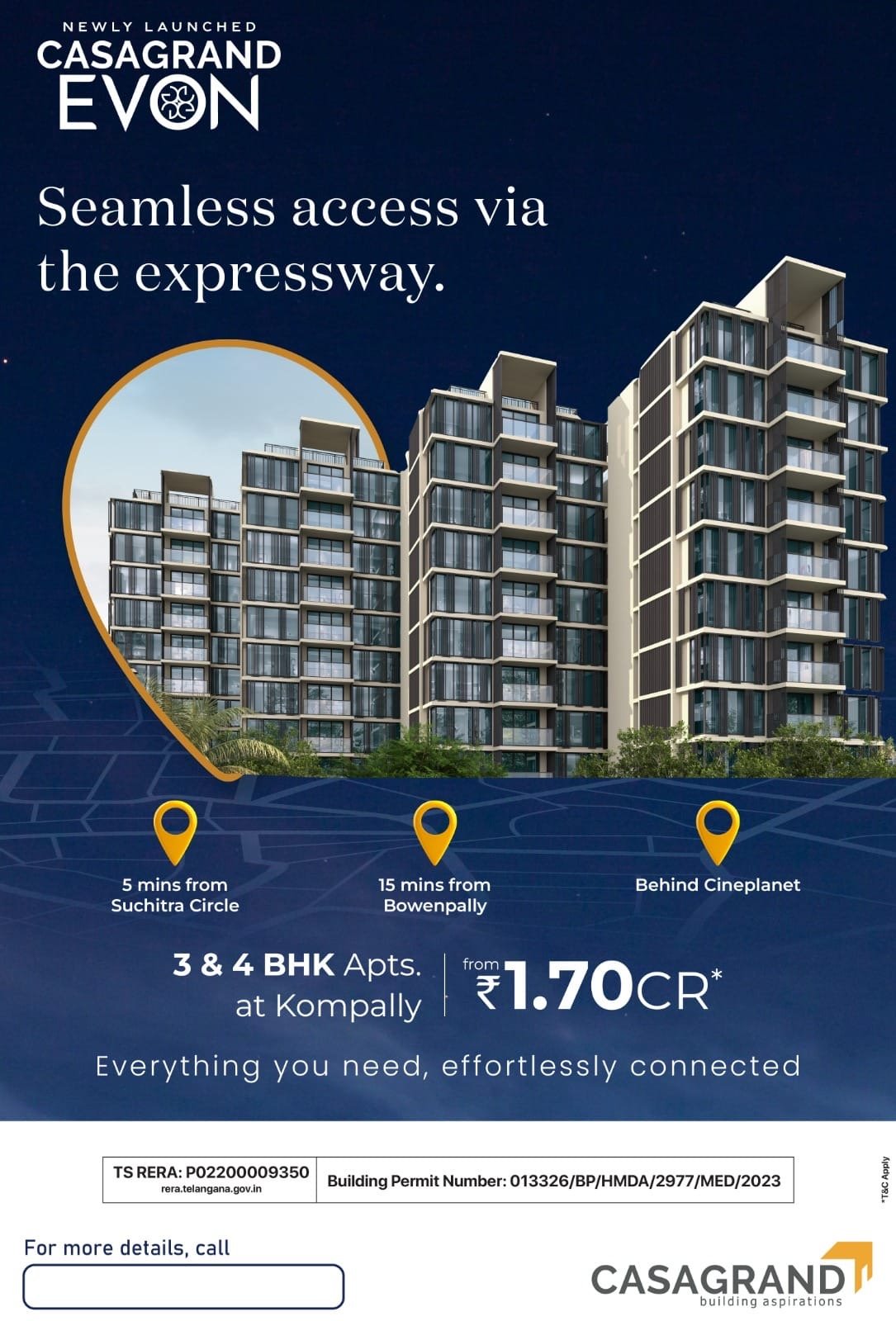 Strategically located in Kompally, behind The Can Planet, Casagrand Evon enjoys excellent connectivity to major road networks, educational institutions, healthcare facilities, retail zones, and employment hubs across North Hyderabad.